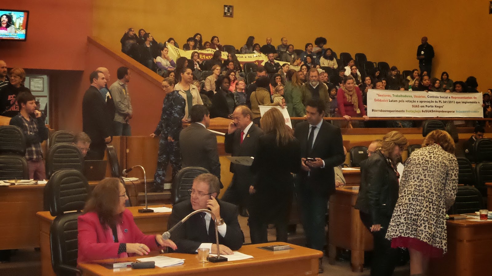 E voltamos com projeto do Executivo que trata da reestruturação da Fundação de Assistência Social e Cidadania (Fasc) na Ordem do Dia, para discussão e votação. Por isso, as galerias lotadas por funcionários da fundação, munidos de muitos cartazes e reivindicações.