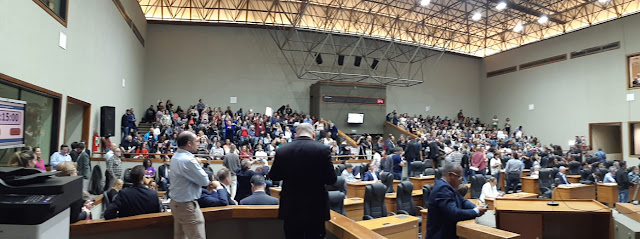 Agora são 23h e a presença dos municipários é intensa e participativa, dentro e fora do plenário, assim como das lideranças dos sindicatos e de vereadores. A imprensa faz a cobertura com atenção e interesse. A TV Câmara está transmitindo ao vivo pelo facebook.